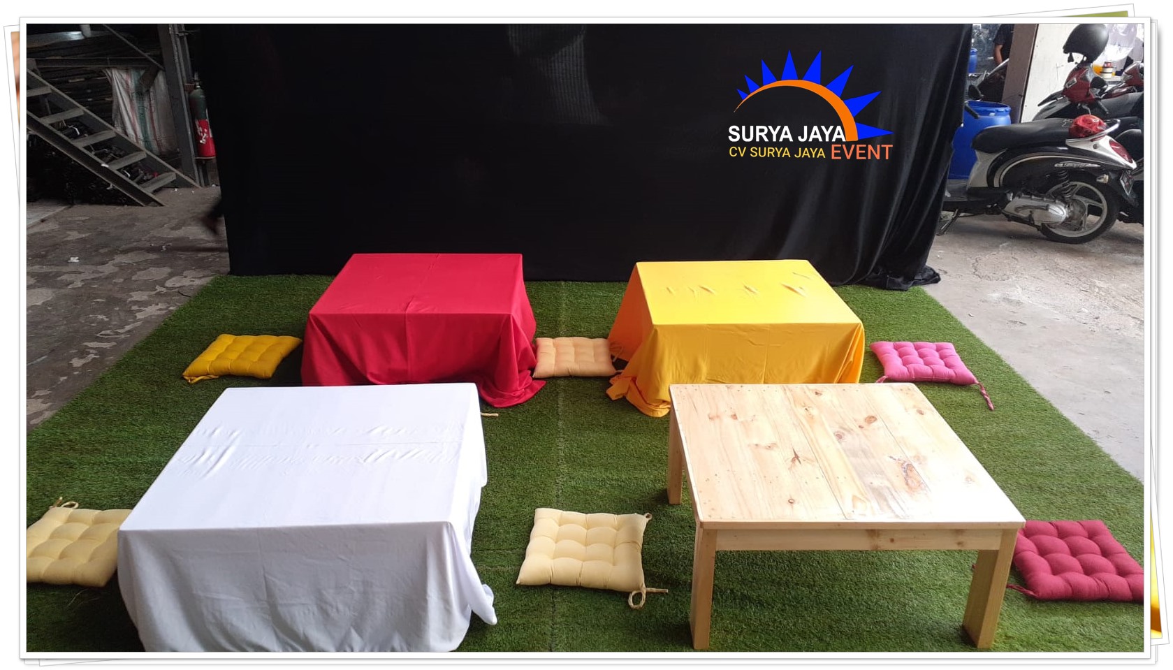 Untuk anda yang sedang membutuhkan meja lesehan maupun kebutuhan lainnya ayo sewa nya di CV.Surya Jaya Event kami saja yang kualitasnya bagus dan harga nya juga terjangkau.Untuk informasi selengkap nya silahkan hubungi kami ke nomor 0877.7222.2136 ( BAPAK RAHMADI ).Kami siap memberikan yang terbaik untuk anda dan siap mendukung suksesnya acara anda.