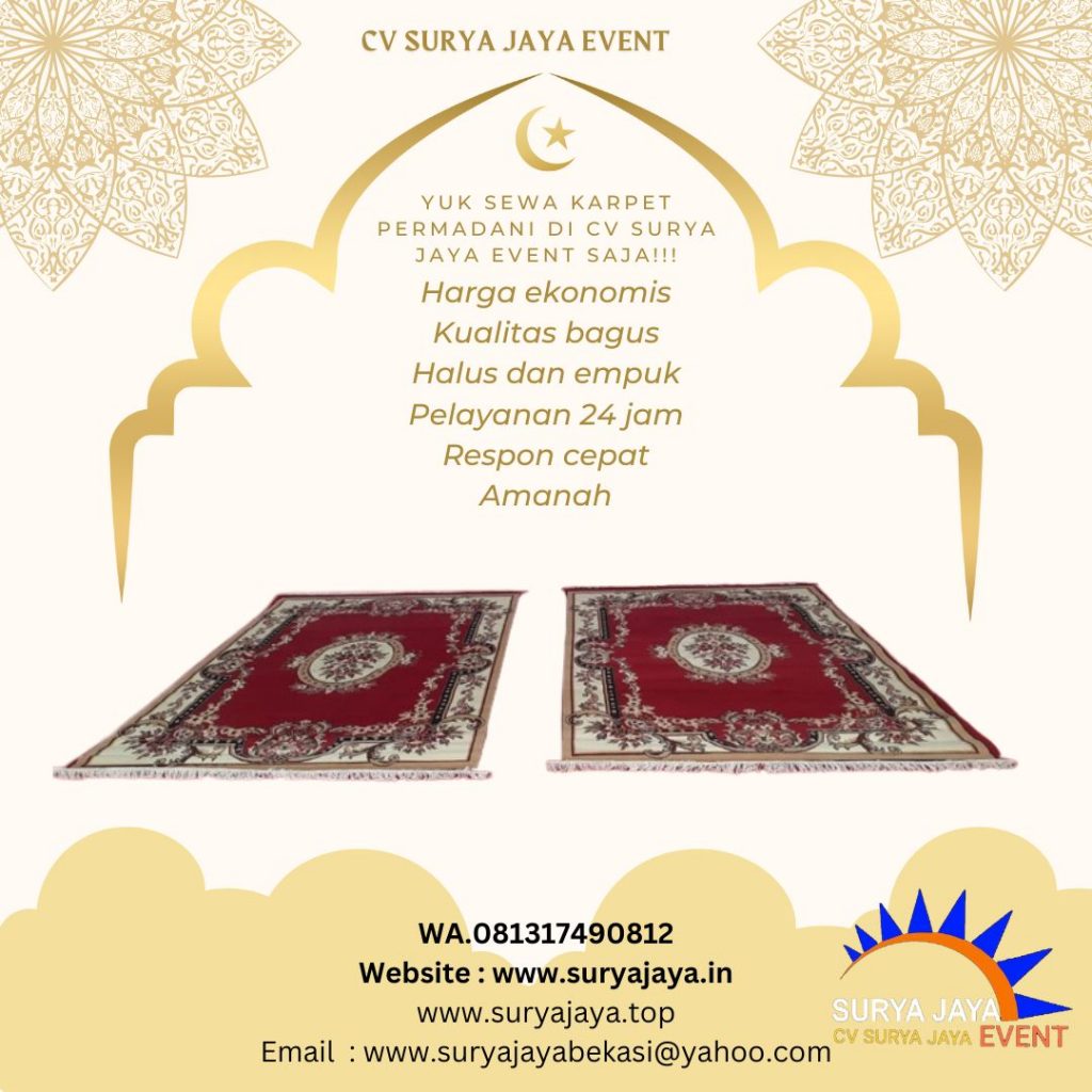 CV SURYA JAYA EVENT Sewa Karpet Permadani Di Jakarta Harga Murah kualitas bagus.Karpet permadani yang disewakan ini motifnya bagus,bahannya halus dan empuk.Karpet permadani tersedia warna hijau dan merah.Untuk ukuran karpet permadani 2×3 m.Karpet permadani ini bisa digunakan untuk acara bukber,acara pengajian,acara sholat tarawih,acara arisan dan bisa juga untuk acara-acara lainnya.Karpet permadani bersih terawat siap pakai.Berapa saja yang dibutuhkan,kami siap memenuhi kebutuhan karpet permadani untuk acara anda.Ayo pesan sekarang juga untuk kebutuhan karpet permadani.Untuk pemesanan bisa langsung menghubungi kami melalui kontak yang tersedia diwebsite ini.