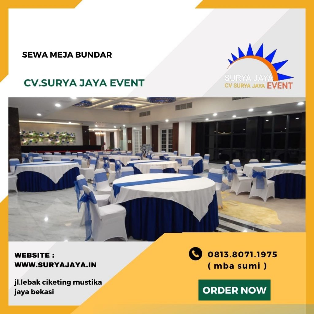 CV.SURYA JAYA EVENT melayani Jasa Sewa Meja Bundar Bojongsari Depok Pelayanan Terbaik siap antar.Meja bundar yang kami sewakan ini tersedia beberapa ukuran mulai dari meja bundar ukuran d:120 cm,meja bundar ukuran d:160 cm,meja bundar ukuran d:180 cm.Meja bundar disewa lengkap plus cover meja yang mempunyai kualitas standar hotel sehingga menjadikan meja bundar tampil cantik,rapi,menarik,mewah dan berkelas.Untuk warna dan model cover meja boleh pilih sendiri sesuai permintaan.Untuk cover meja ada yang model tebar dan ada juga yang model skirting.Untuk cover tebar tersedia warna putih,hitam,gold.Untuk cover skirting tersedia warna putih,hitam,