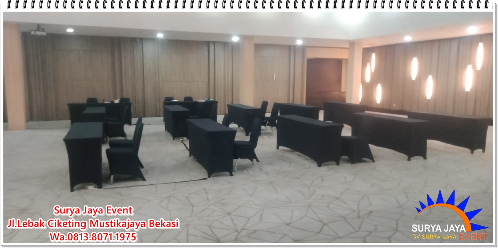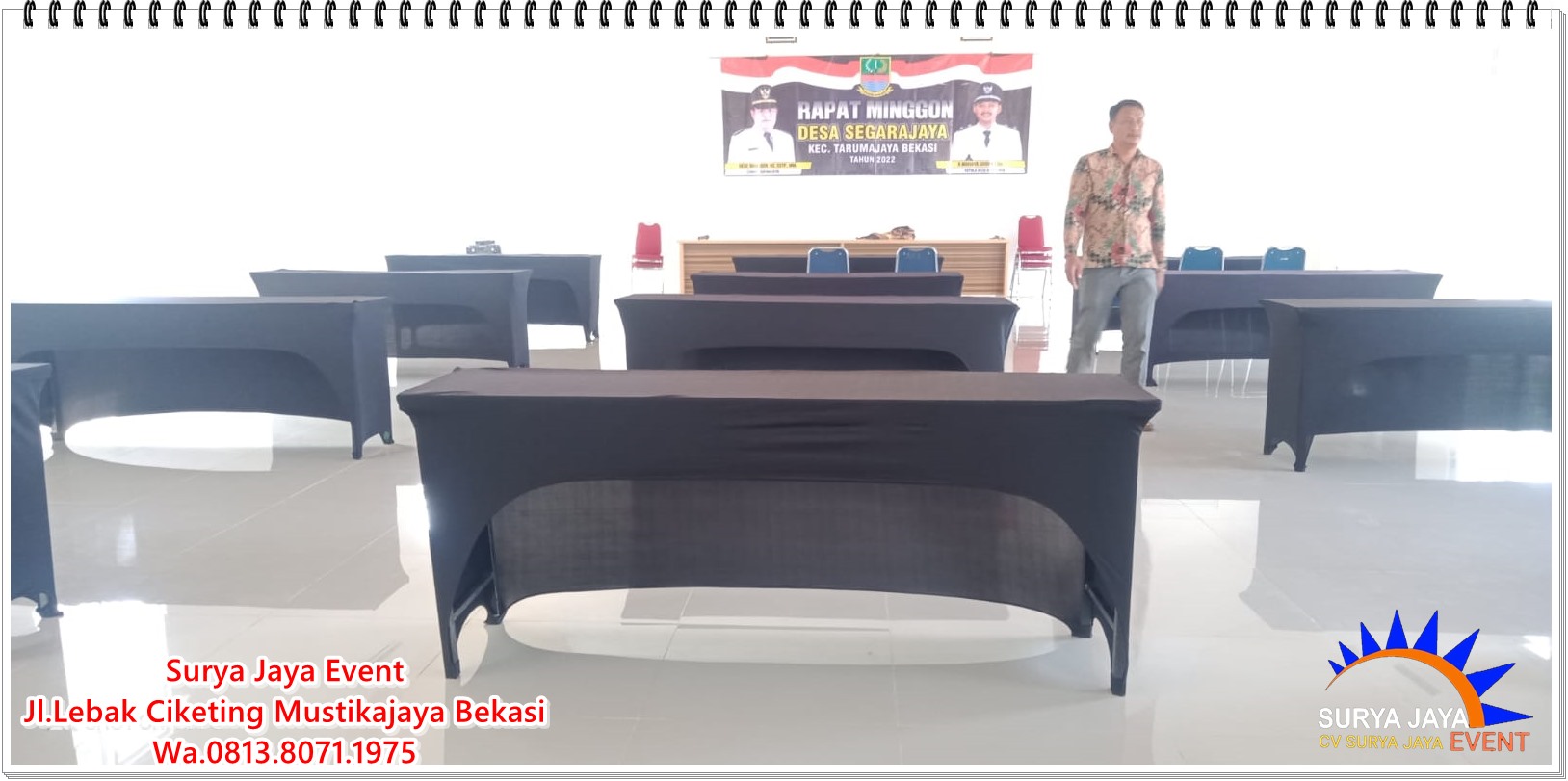 CV SURYA JAYA EVENT melayani Sewa Meja Ibm Cover Stretch Hitam Untuk Event Di Jakarta dan sekitarnya. Meja ibm memang tampil cantik,rapi,menarik,mewah dan berkelas dengan dilengkapi cover meja karena cover meja mempunyai kualitas standar hotel. Untuk warna cover model stretch tersedia warna hitam,putih,merah. Sedangkan cover model skirting tersedia banyak pilihan yaitu warna putih,hitam,merah,maroon,biru,hijau,gold,coklat dan lain-lain. Dijamin cover meja bersih,wangi,tidak lecek,tidak lusuh,tidak robek. Ukuran meja ibm tersedia beberapa pilihan mulai dari meja ibm 45x180cm,meja ibm 60x180cm,meja ibm 80x180cm,meja ibm 90x180cm. Meja ibm terbuat dari multiflek dan hpl,kerangkanya dari besi. Tentunya meja ibm punya kami bisa dilipat sehingga memudahkan saat pengiriman. CV SURYA JAYA EVENT kami menyediakan kursi futura lengkap plus cover atau bisa juga sewa polos tanpa cover tentunya sesuai permintaan customer.