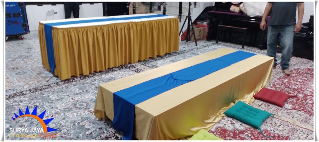 CV.Surya Jaya Event melayani jasa Sewa Meja Bundar Jakarta Timur Plus Cover Standar Hotel siap antar area JABODETABEK dan di wilayah sekitarnya.Untuk biaya pengiriman gratis ongkir dengan syarat dan ketentuan yang berlaku.Meja bundar plus cover meja warna biru topping putih runner biru ini pernah disewa di acara KPP Madya 2 Jakarta Timur.Untuk kursi nya kursi futura raja lengkap dengan sarung kursi ketat warna putih dan pita biru.Untuk warna cover meja,topping,runner,sarung kursi dan pita ada juga lho pilihan warna lainnya jadi bisa pilih sendiri sesuai selera atau bisa juga sesuaikan dengan tema acara.Untuk ukuran meja bundar ada tiga ukuran dimulai dari meja bundar ukuran d:120 cm,meja bundar ukuran d:160 cm,meja bundar ukuran d:180 cm.CV.Surya Jaya Event siap merentalkan meja bundar dan kursi futura raja dengan jumlah ribuan unit siap kirim kapan saja.Meja bundar dan kursi futura raja bisa digunakan untuk berbagai acara lho.